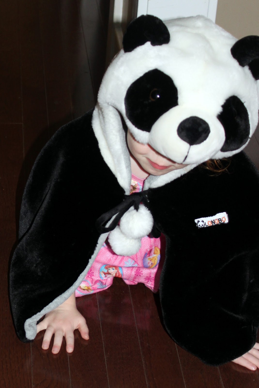 Uncle Blake brought Lucy this panda cape back from China. Previously unknown to Blake, Lucy has an ongoing, crazy, imaginative story that she tells us about a panda bear. She visits this panda in his cave house in the forest and is often cold while visiting him. I think this warm cape may have finally solved her problem.